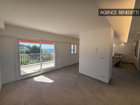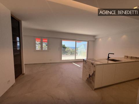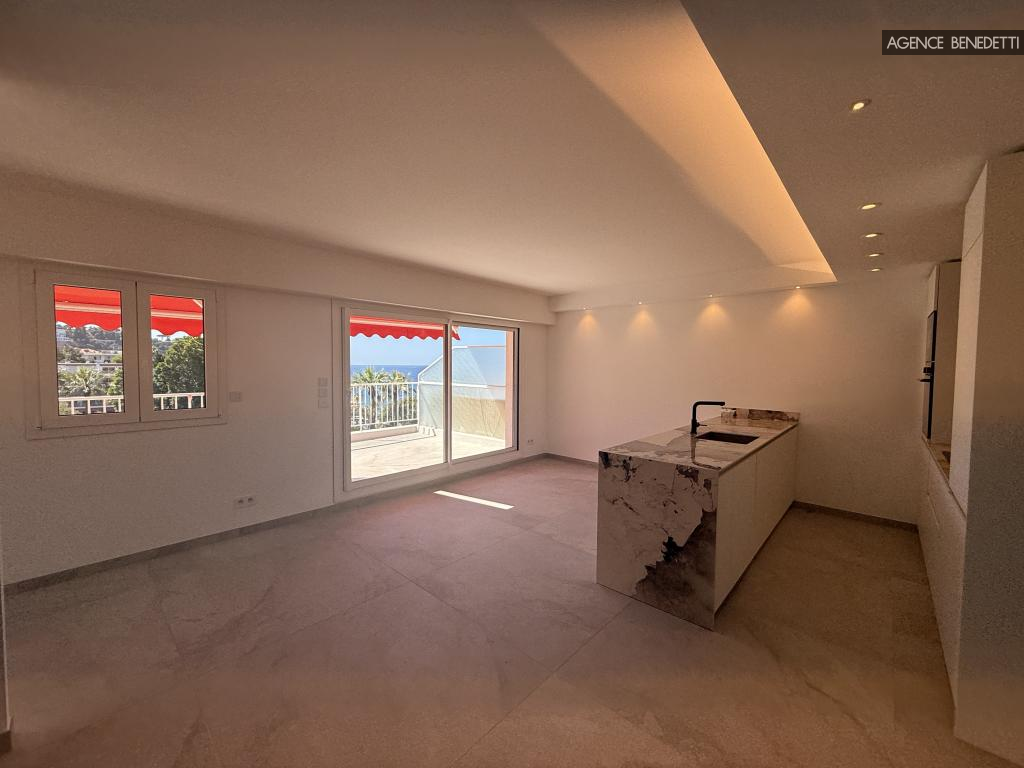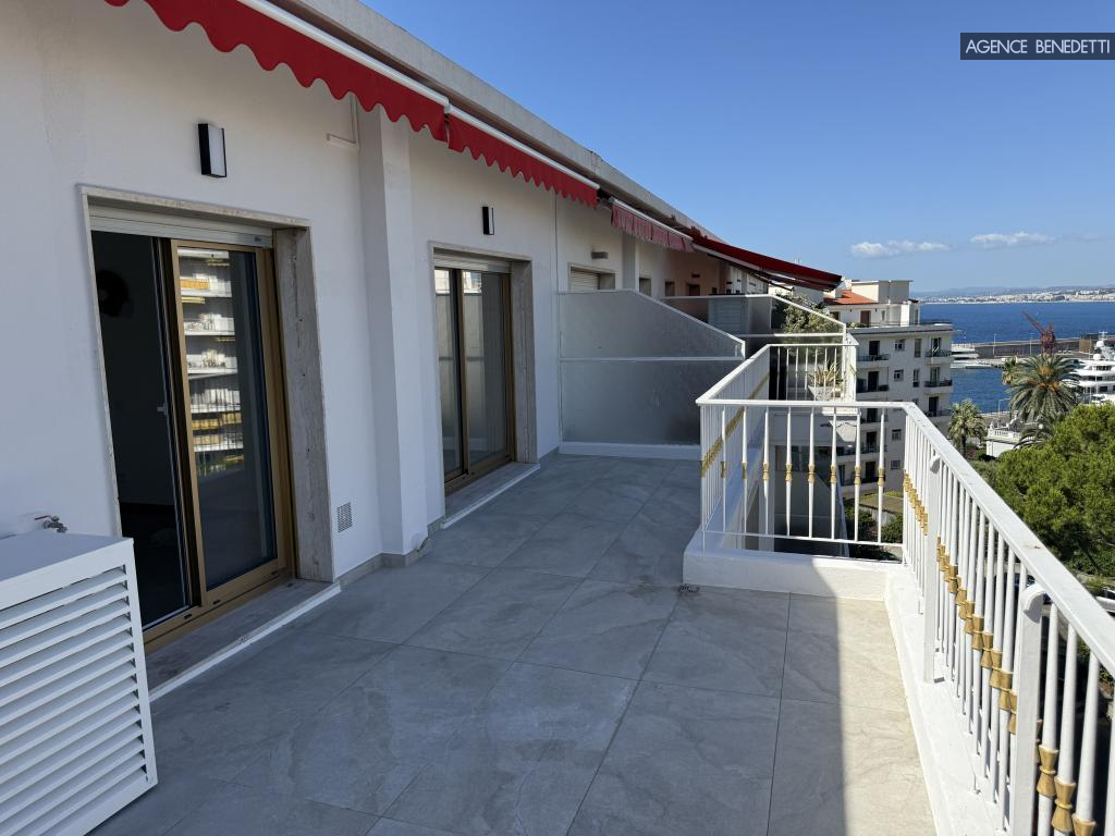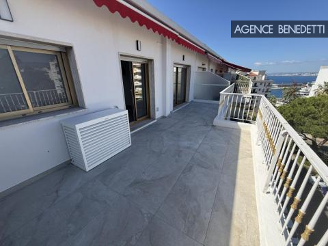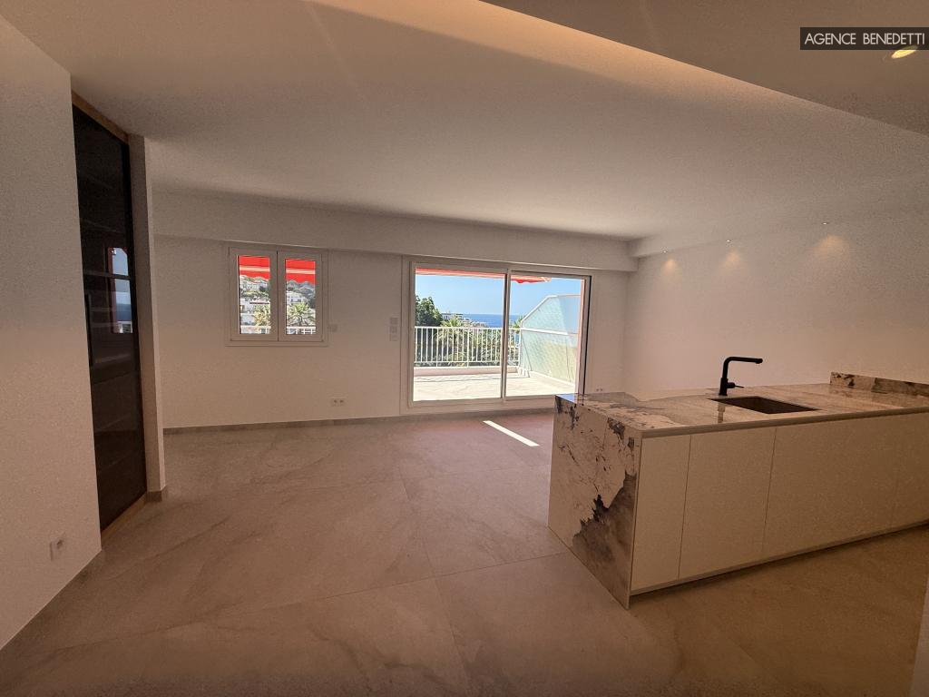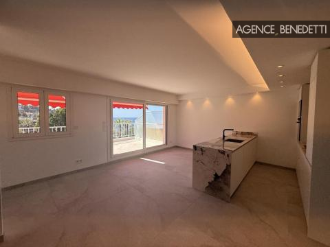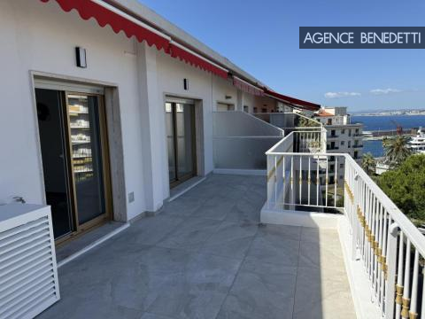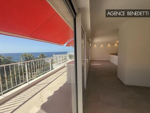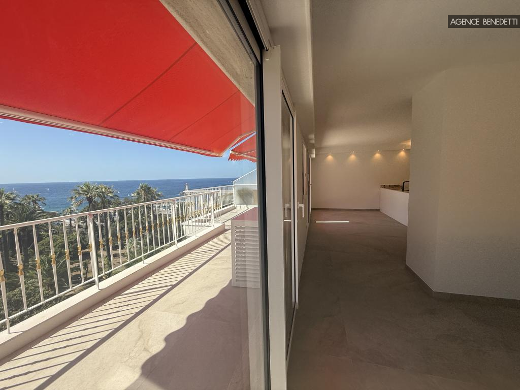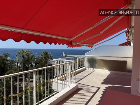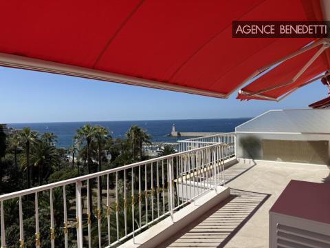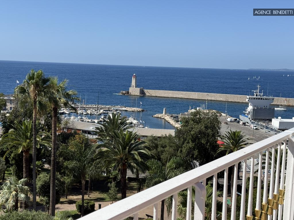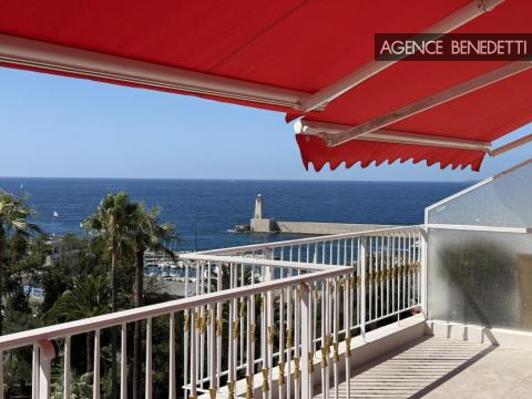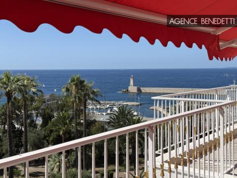 Co-Exclusivité. Très rare sur le marché, ce dernier étage traversant offre une vue dominante et imprenable sur la mer, le Parc Viger et le port de Nice, ainsi que sur les charmantes villas Belle Époque du Mont-boron et la végétation environnante.