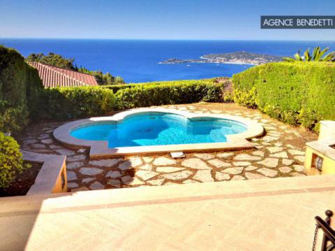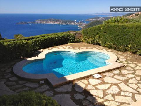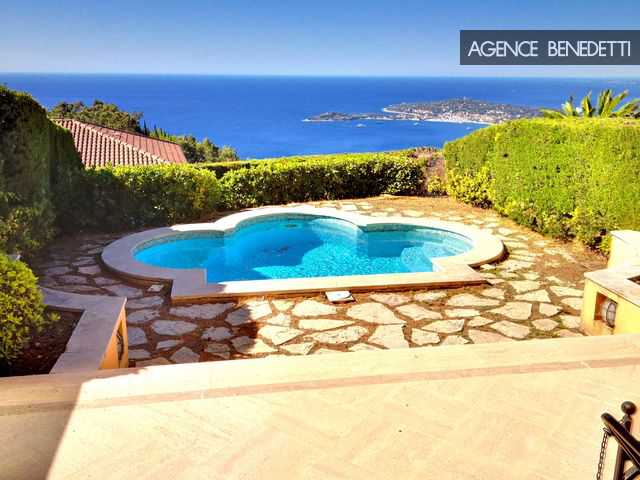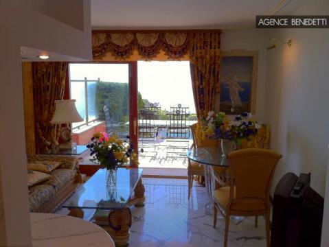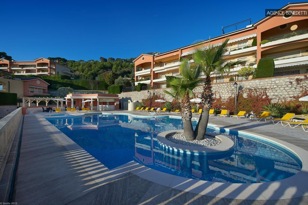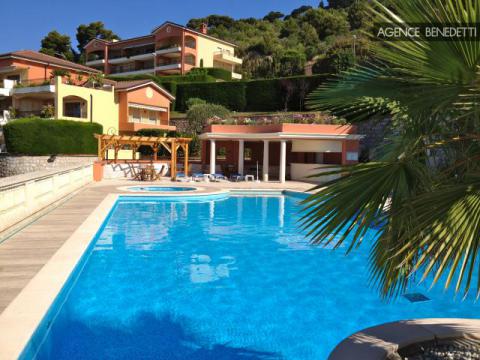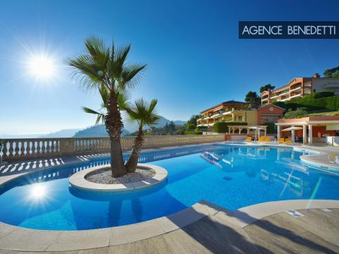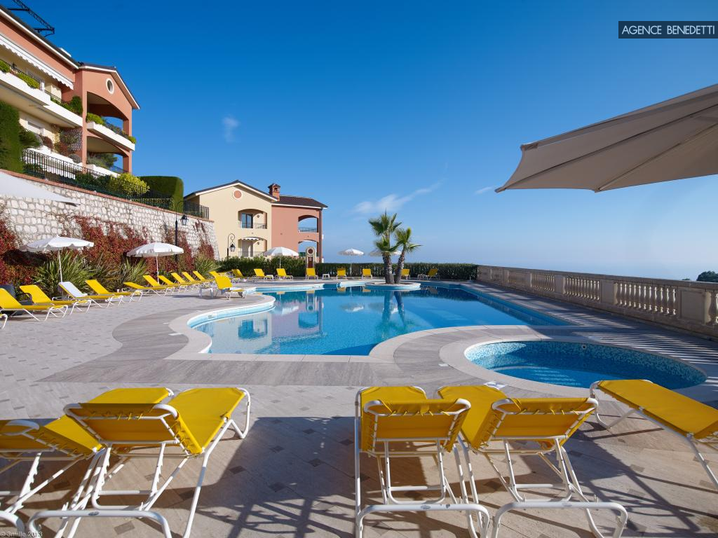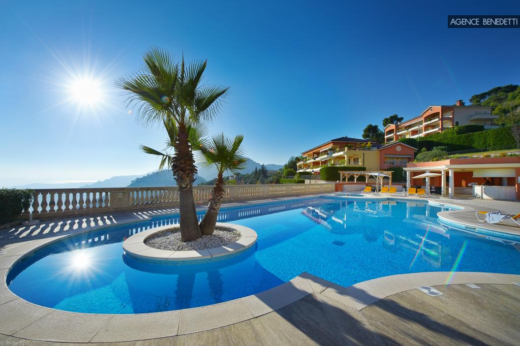 Magnifique 2 pièces ouvert sur une vaste terrasse avec piscine privée, offrant une vue à couper le souffle sur la Méditerranée, le village médiéval d’Èze et la presqu’île de Saint-Jean-Cap-Ferrat.